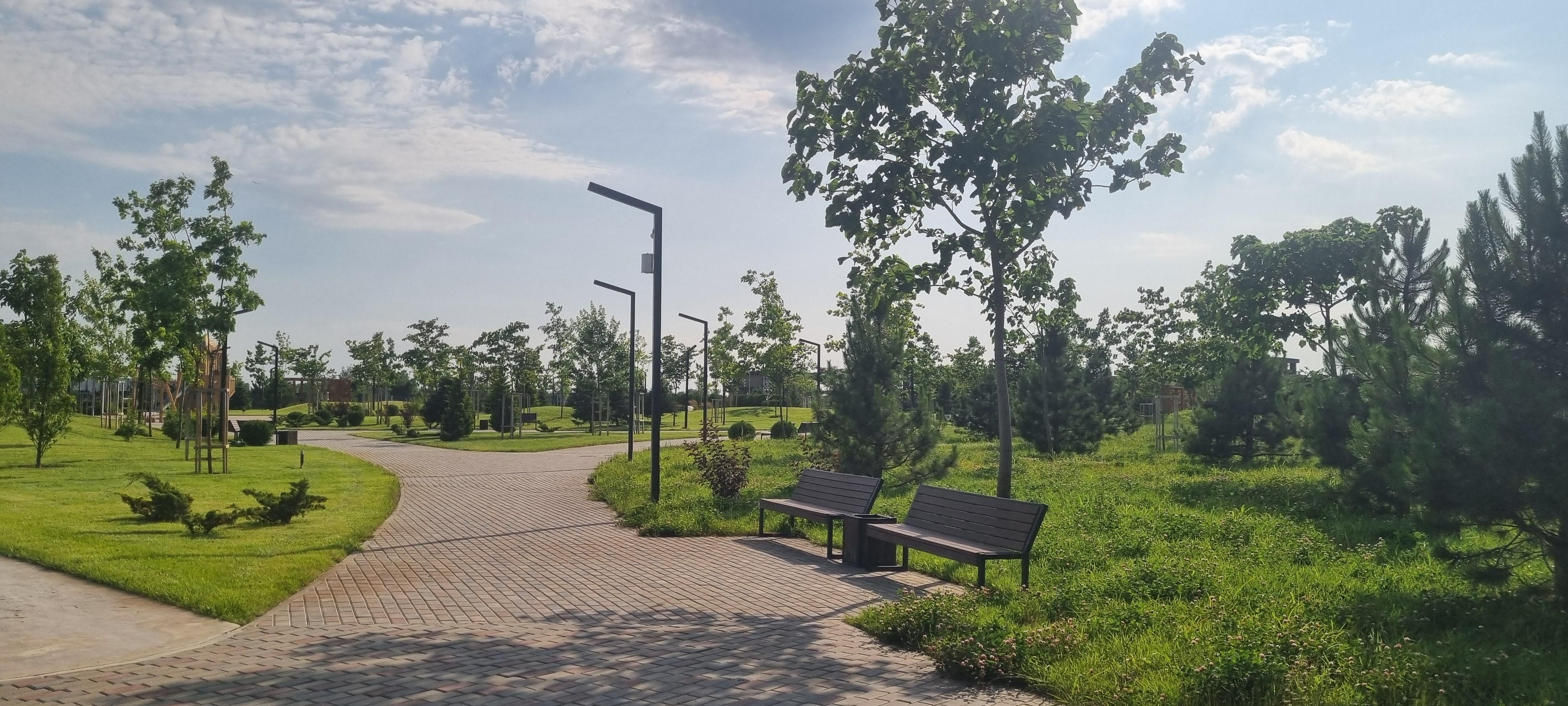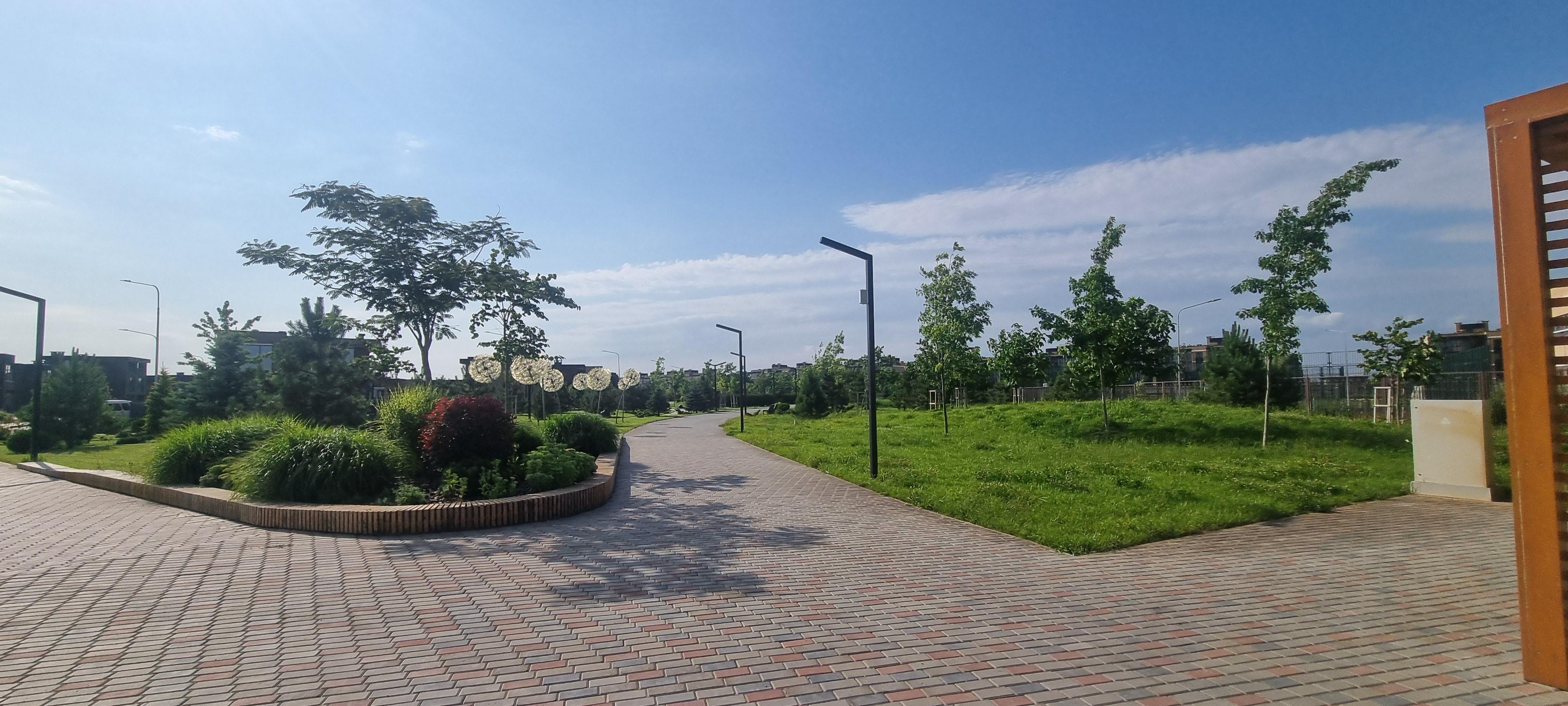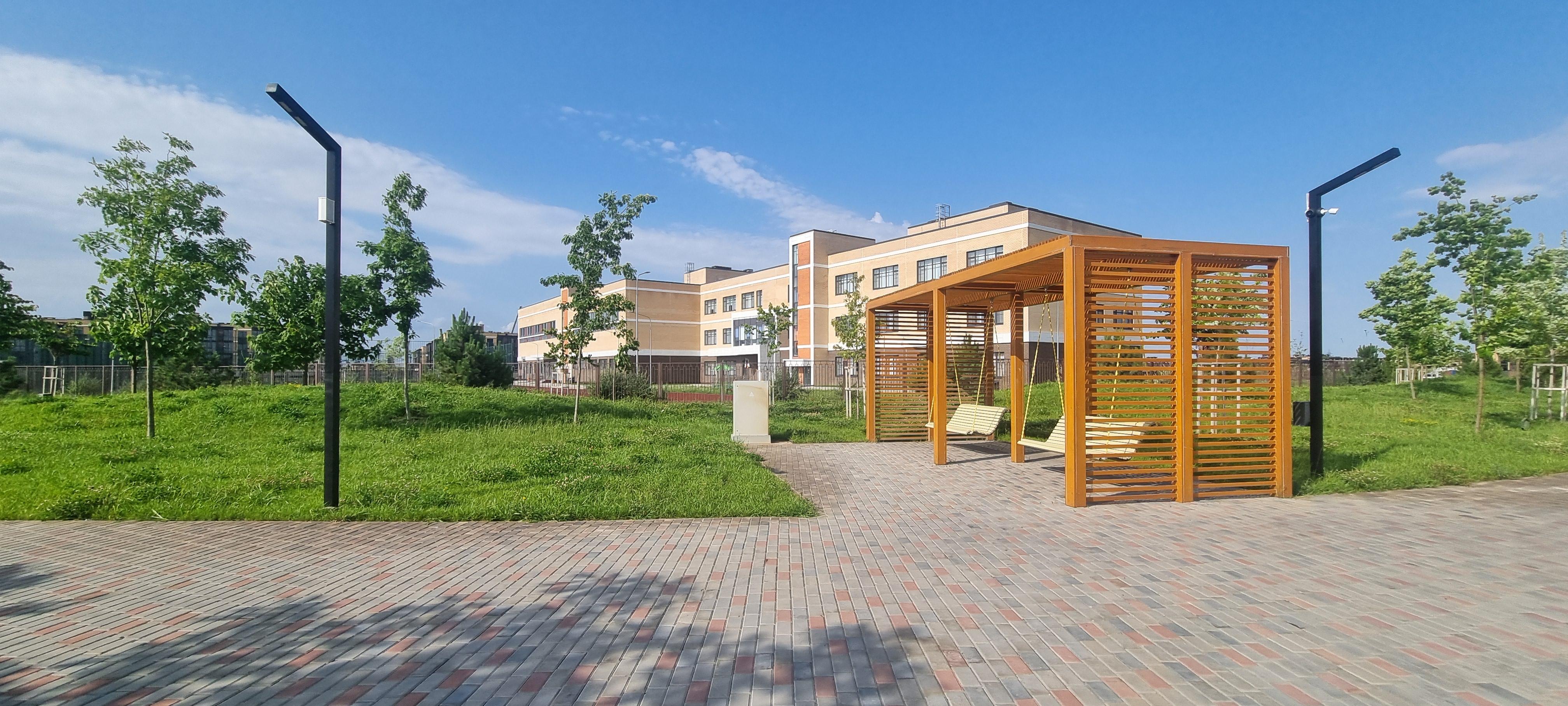 Сквер для прогулок с детскими площадками и зонами для спорта. Школа и детский сад уже принимают детей.