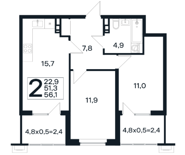Продается 2-х комн. новостройка, 56.1 кв.м., 3/4 эт