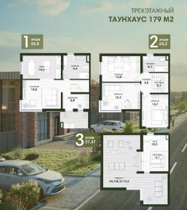 Трех этажный дом, терасса на 3 этаже и зона приготовления барбекю.