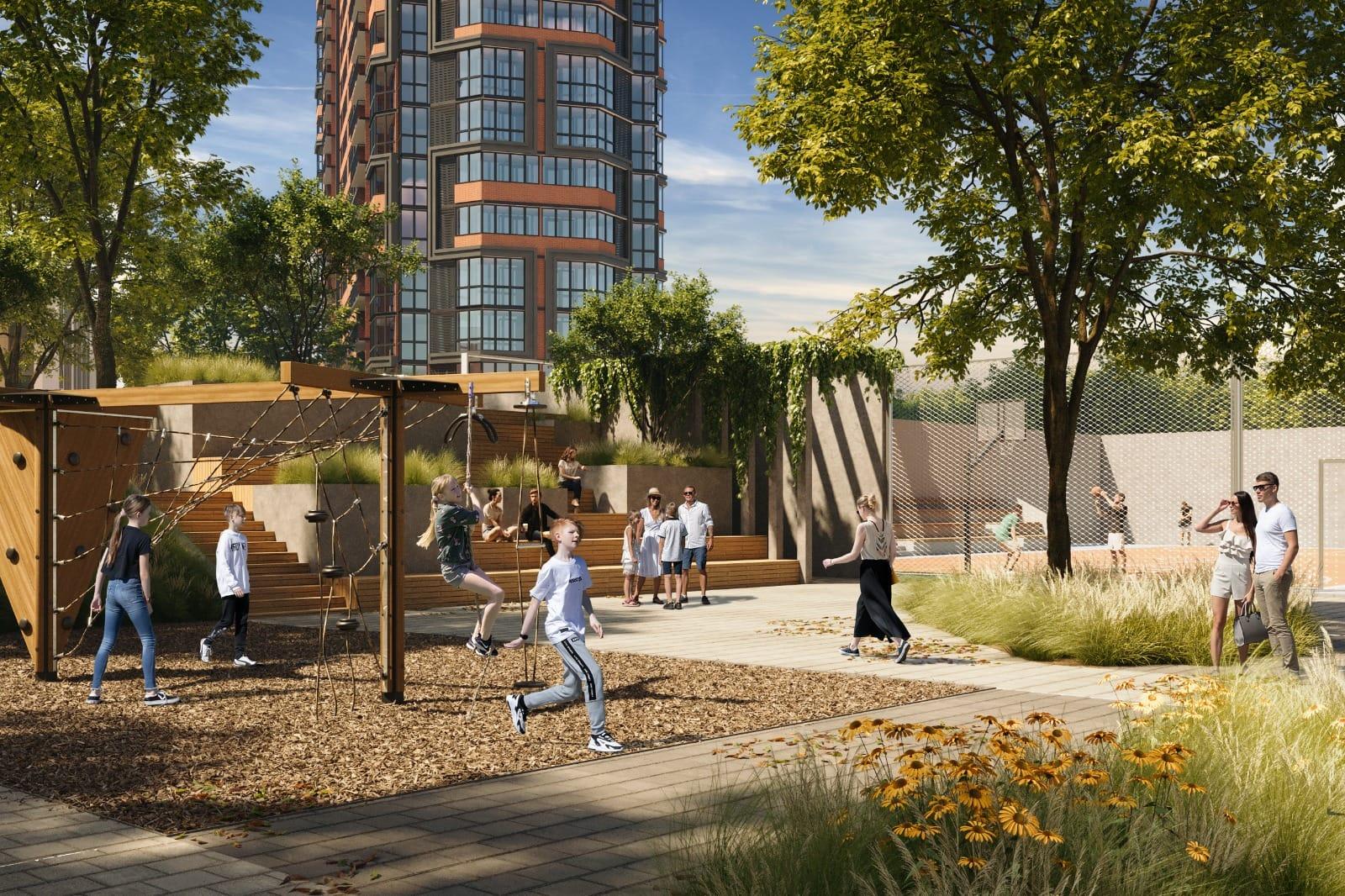 На территории комплекса есть все для максимально комфортного проживания: фитнес с бассейном, подземный и многоуровневый наземный паркинг с зарядками для электромобилей, детские и спортивные площадки для разных возрастов, фонтаны, ресторанный дворик с аллеей...