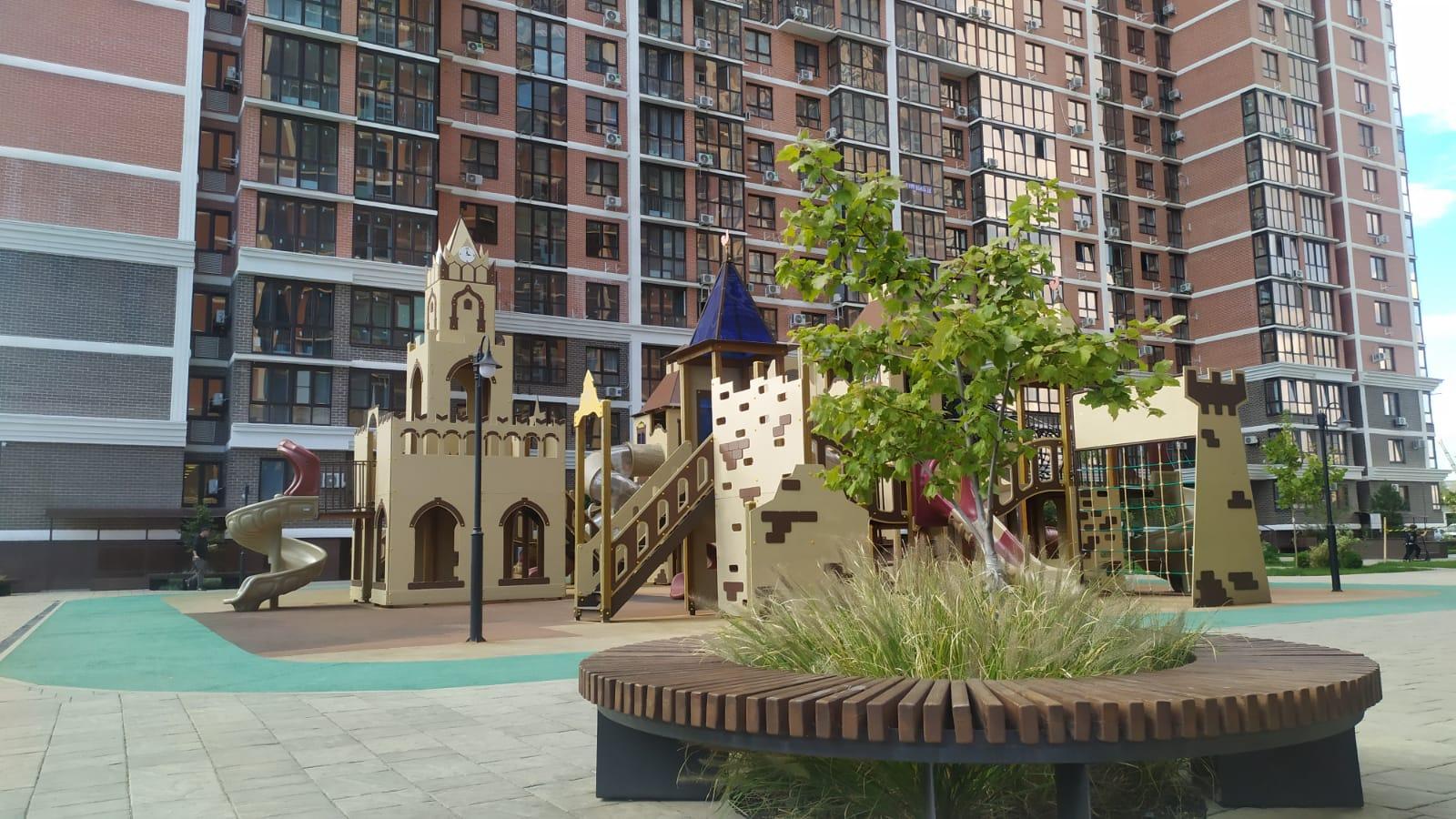 На территории комплекса есть все для максимально комфортного проживания: фитнес с бассейном, подземный и многоуровневый наземный паркинг с зарядками для электромобилей, детские и спортивные площадки для разных возрастов, фонтаны, ресторанный дворик с аллеей...