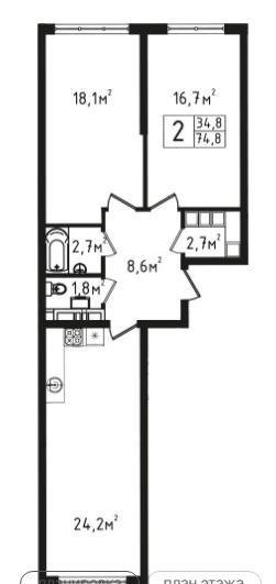 Замечательная планировка на две стороны подойдет для семьи с 1-2 детками, большая кухня-гостиная 24 квадратных метра!