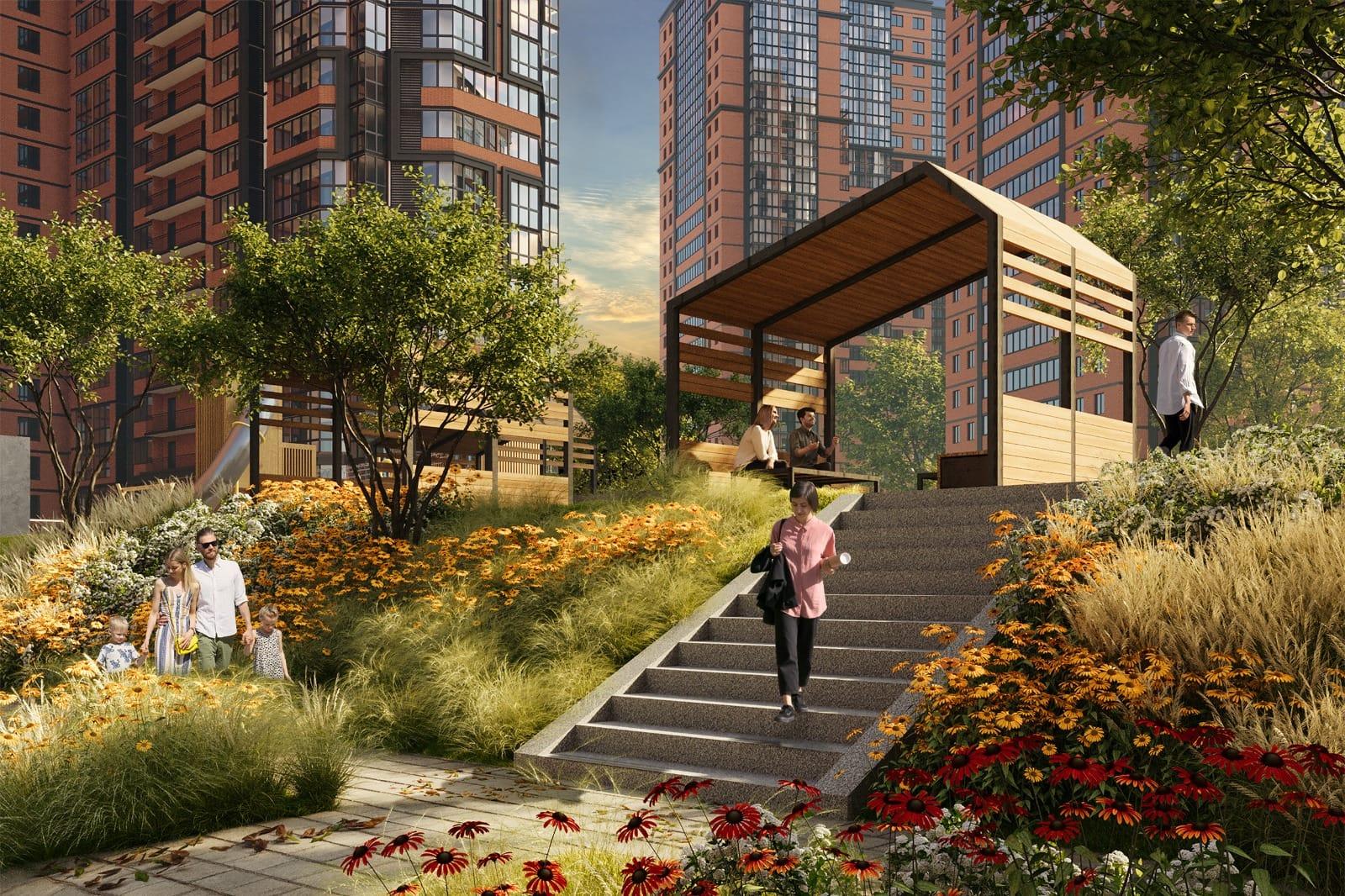 На территории комплекса есть все для максимально комфортного проживания: фитнес с бассейном, подземный и многоуровневый наземный паркинг с зарядками для электромобилей, детские и спортивные площадки для разных возрастов, фонтаны, ресторанный дворик с аллеей...