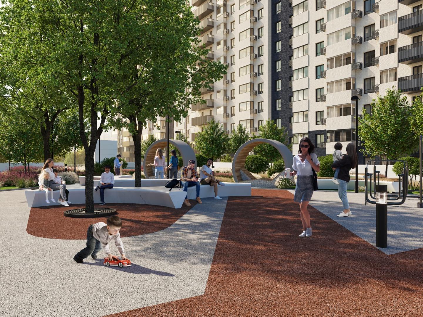 Выйдя с территории жк вас встречает прекрасная зеленая аллея с фонтаном и зонами отдыха!