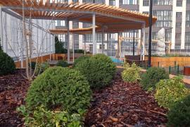 Шикарный стилобат с мангальными зонами, фонтаном, детскими и спортивными площадками, зеленым бульваром для прогулок и отдыха!