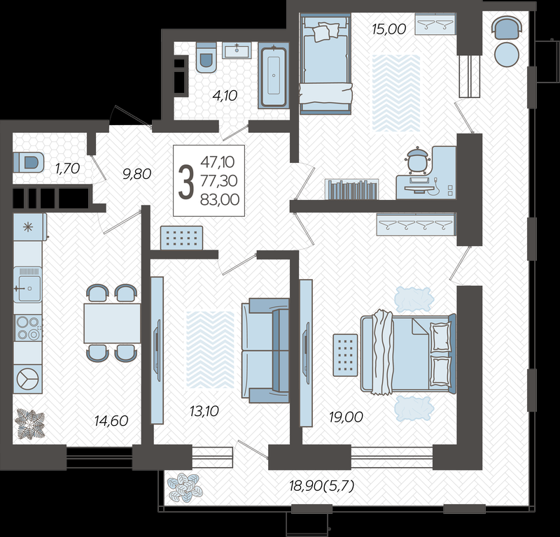 Планировка с ленточной лоджией и выходом из каждой комнаты!