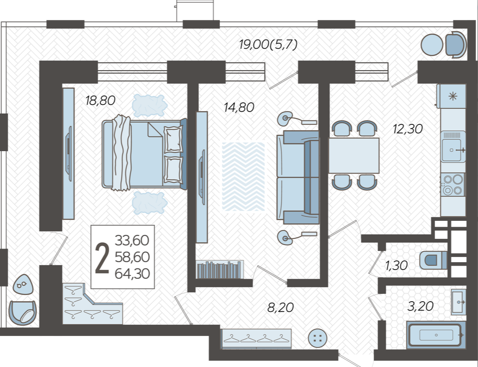 Двухкомнатная квартира с огромной лоджией в новом комплексе класса комфорт+