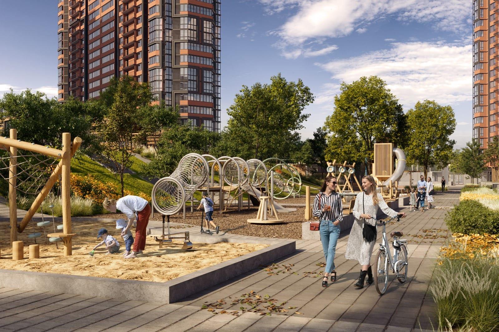 На территории комплекса есть все для максимально комфортного проживания: фитнес с бассейном, подземный и многоуровневый наземный паркинг с зарядками для электромобилей, детские и спортивные площадки для разных возрастов, фонтаны, ресторанный дворик с аллеей...