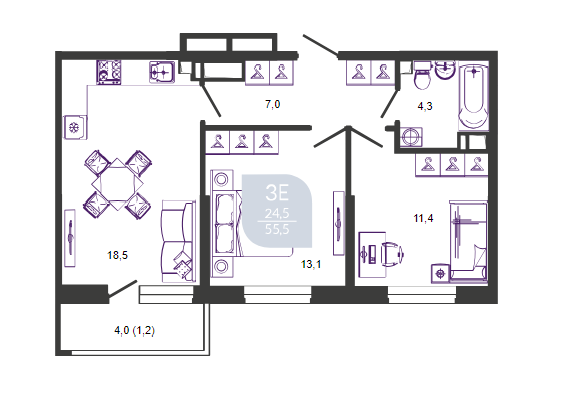 Трехкомнатная квартира, улучшенной планировки с огромной кухней-гостинной, два просторных сан.узла, две лоджии.