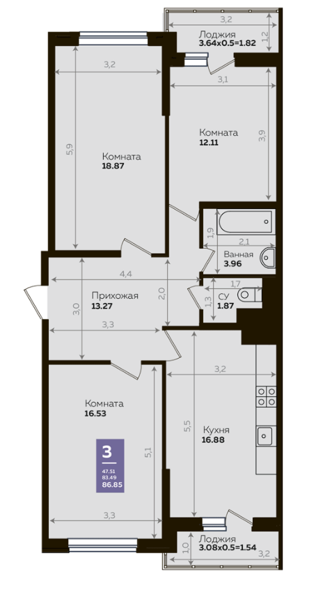 Трехкомнатная квартира в комплексе класса комфорт+ рядом с парком "Краснодар"