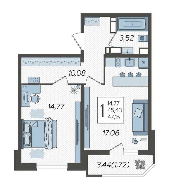 Продается однокомнатная новостройка, 47.14 кв.м., 12/23 эт