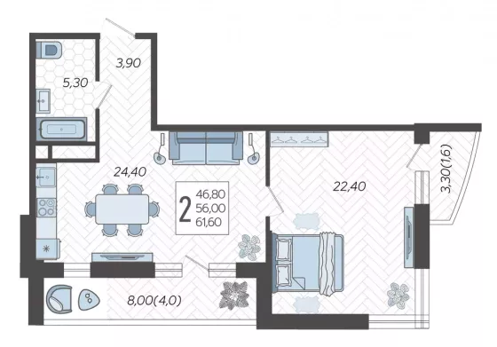 Продается 2-х комн. новостройка, 61.6 кв.м., 8/16 эт