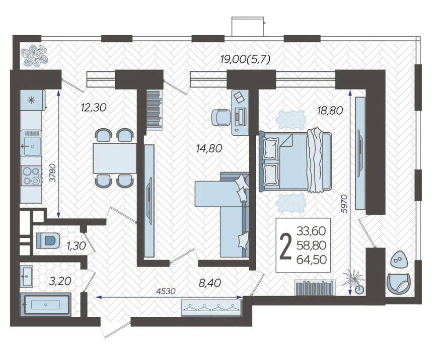Двухкомнатная квартира в новом комплексе класса комфорт+.