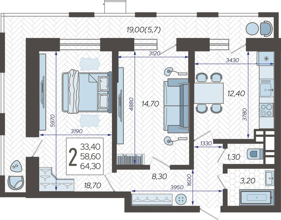 Продается 2-х комн. новостройка, 65 кв.м., 2/12 эт