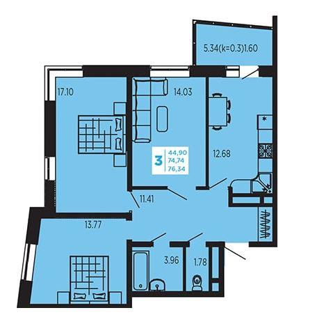 Продается 3-х комн. новостройка, 76.34 кв.м., 19/24 эт