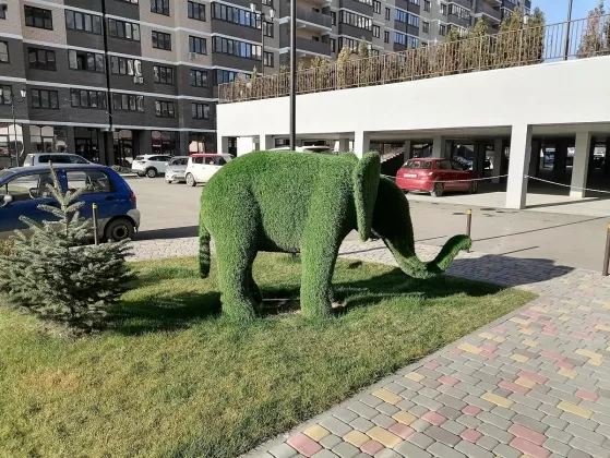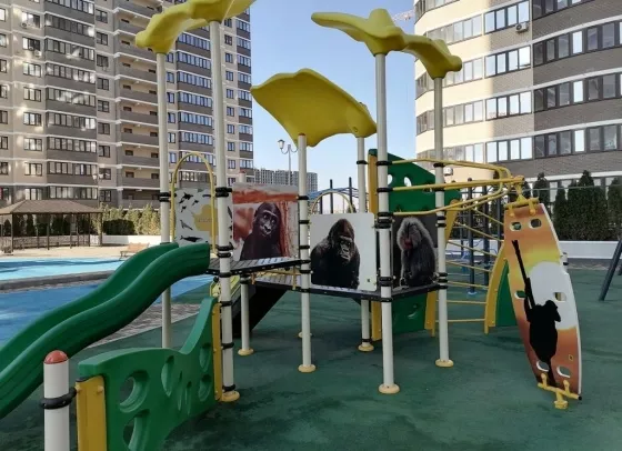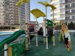 Красочно оформлены детские площадки на стилобате, внизу под стилобатом парковка для авто, зеленые аллеи, фонтан и скамейки для отдыха., это придает настроение и уют для жителей этого микрорайона
