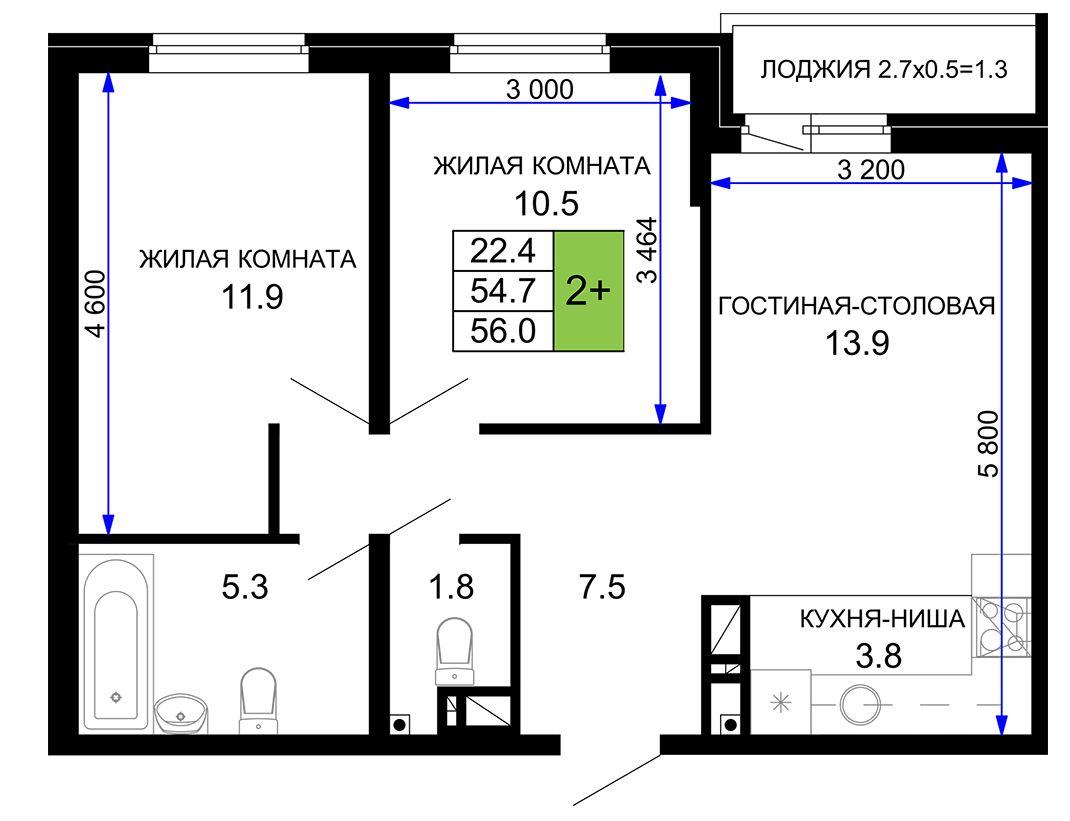 Продается 2-х комн. новостройка, 56 кв.м., 6/16 эт