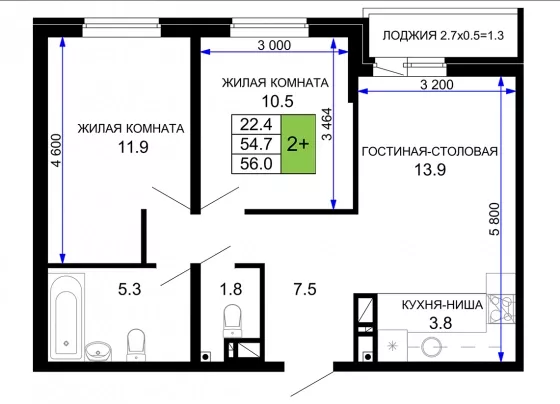 Продается 2-х комн. новостройка, 56 кв.м., 7/16 эт
