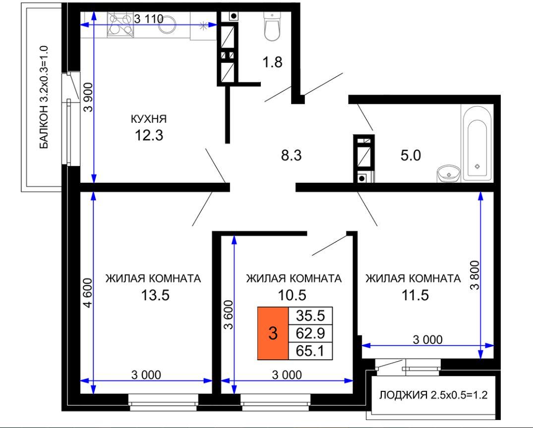 Продается 3-х комн. новостройка, 65.1 кв.м., 3/16 эт