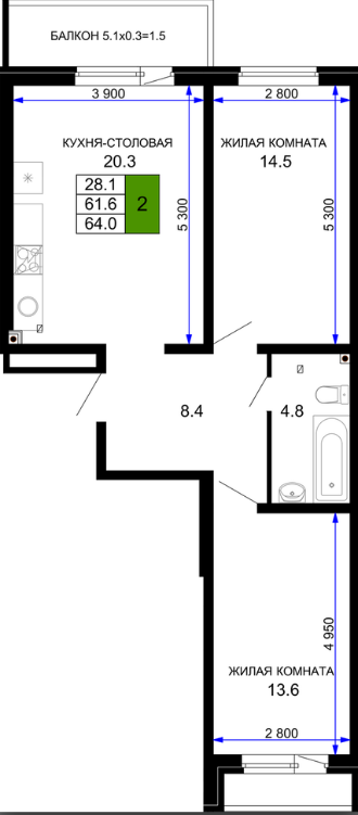 | Площадь, кв.м. | 64 |