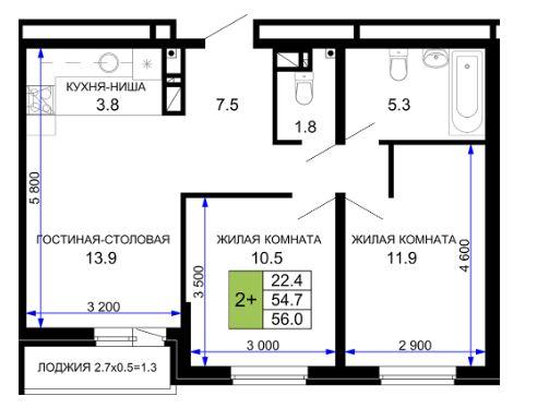 Продается 2-х комн. новостройка, 56 кв.м., 11/16 эт