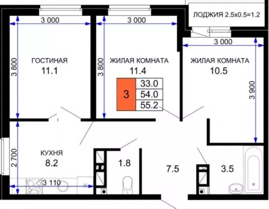 Продается 3-х комн. новостройка, 55.2 кв.м., 12/16 эт