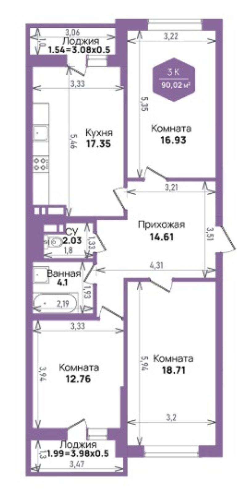 Продается 3-х комн. новостройка, 90.02 кв.м., 20/24 эт