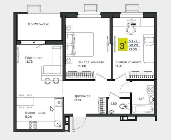 Продается 3-х комн. новостройка, 71.55 кв.м., 3/8 эт