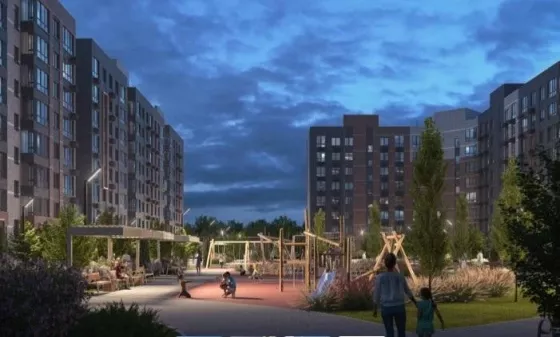Прогулочные аллеи, велодорожка, игровые площадки для детей, места для отдыха взрослых, спортивные площадки, магазины, места для парковки велосипедов, колясок и самокатов.