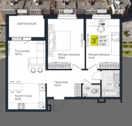 | Жилая площадь | 43.7 |