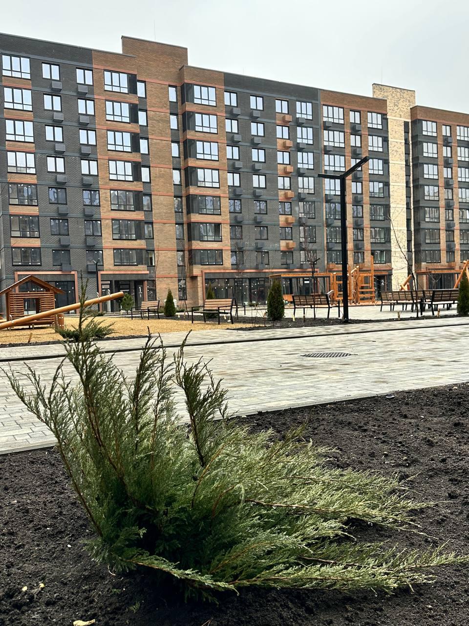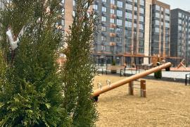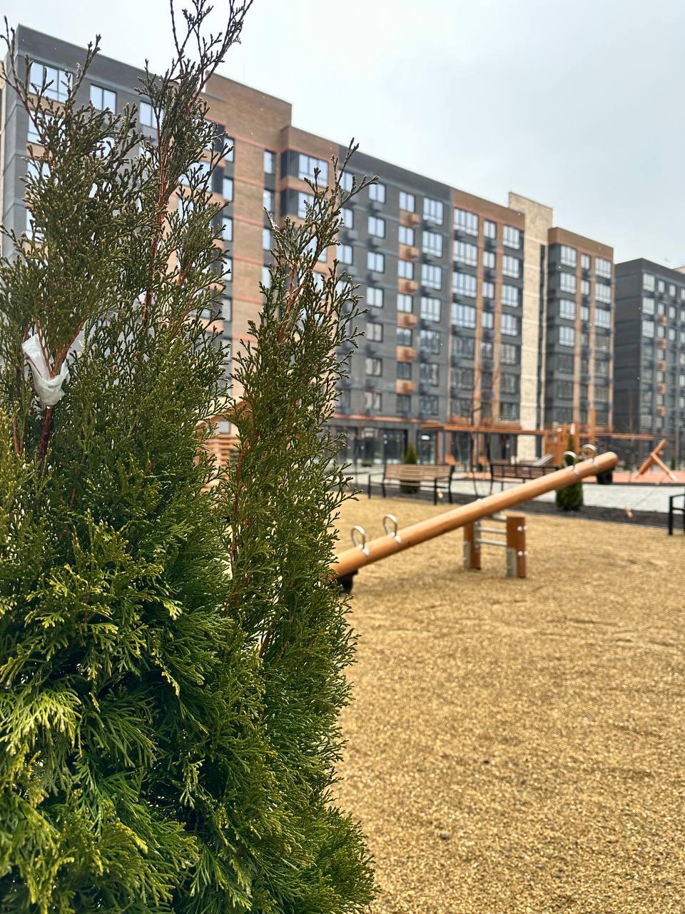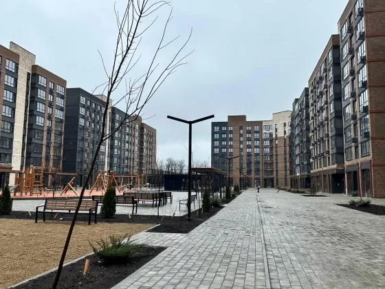 Прогулочные аллеи, велодорожка, игровые площадки для детей, места для отдыха взрослых, спортивные площадки, магазины, места для парковки велосипедов, колясок и самокатов.