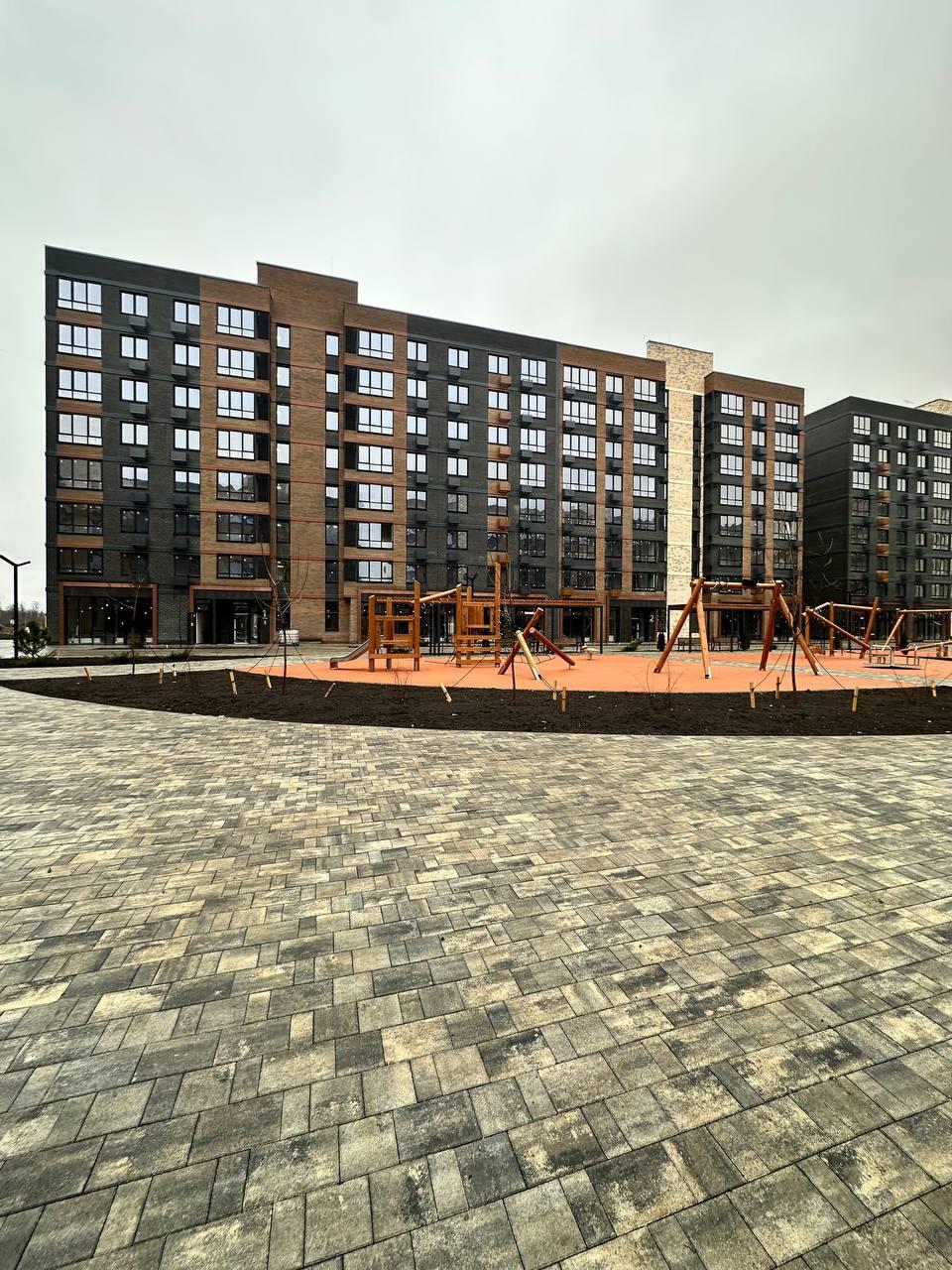 Прогулочные аллеи, велодорожка, игровые площадки для детей, места для отдыха взрослых, спортивные площадки, магазины, места для парковки велосипедов, колясок и самокатов.