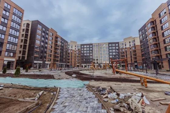 Прогулочные аллеи, велодорожка, игровые площадки для детей, места для отдыха взрослых, спортивные площадки, магазины, места для парковки велосипедов, колясок и самокатов.