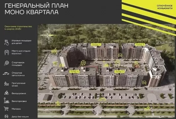 Прогулочные аллеи, велодорожка, игровые площадки для детей, места для отдыха взрослых, спортивные площадки, магазины, места для парковки велосипедов, колясок и самокатов.
