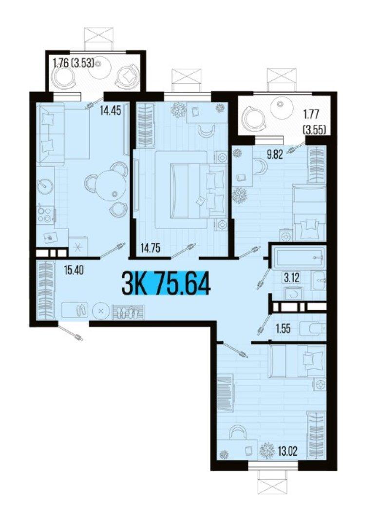 Продается 3-х комн. новостройка, 75.64 кв.м., 7/8 эт