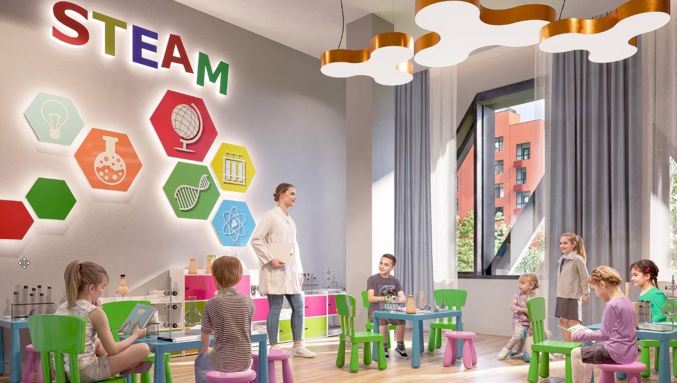 Более 5000 м2  коммерческой инфраструктуры, а также детский сад «УМКА»  НА 350 мест с музеем  и STEAM-лабораторией, а также новая школа на 1550 мест  с дополнительным образованием и кабинетом робототехники.