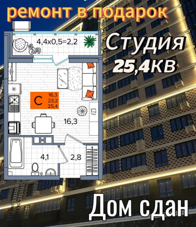 Продается Студия новостройка, 25.4 кв.м., 9/16 эт