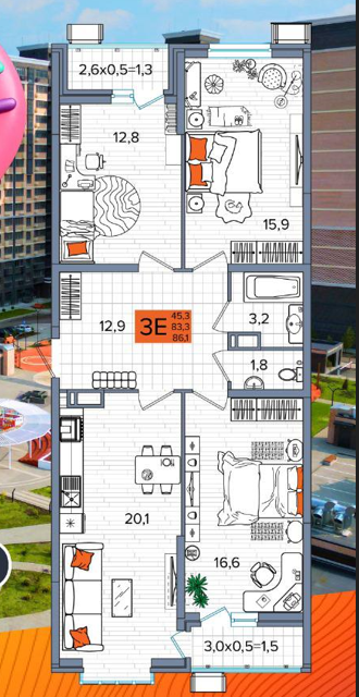 Продается 3-х комн. новостройка, 86.1 кв.м., 4/16 эт