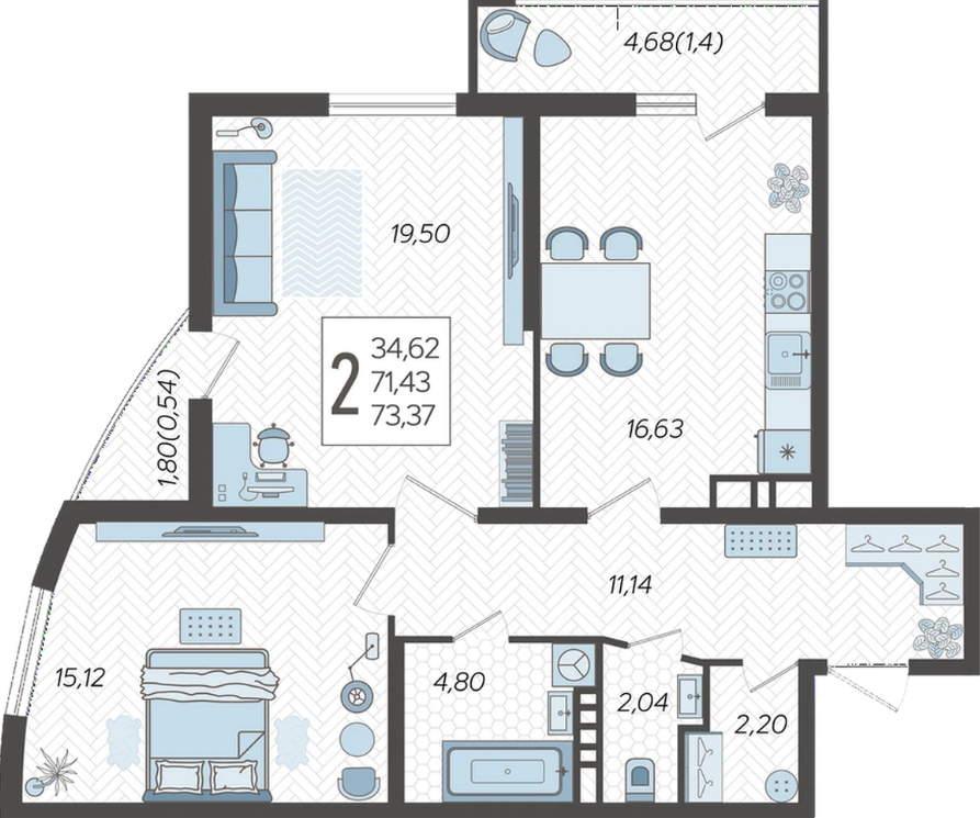 Продается 2-х комн. новостройка, 73.37 кв.м., 14/21 эт