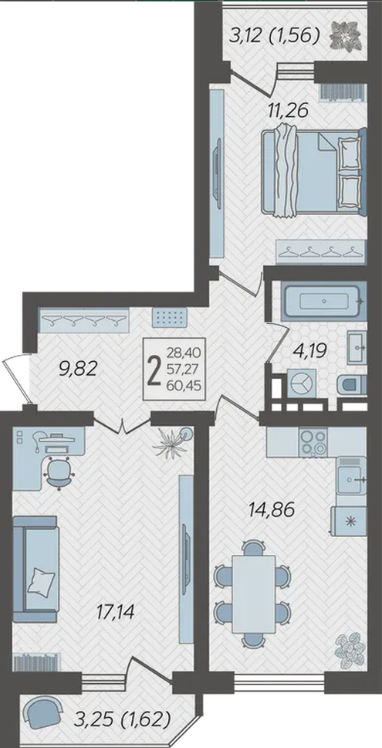 Продается 2-х комн. новостройка, 60.45 кв.м., 8/21 эт