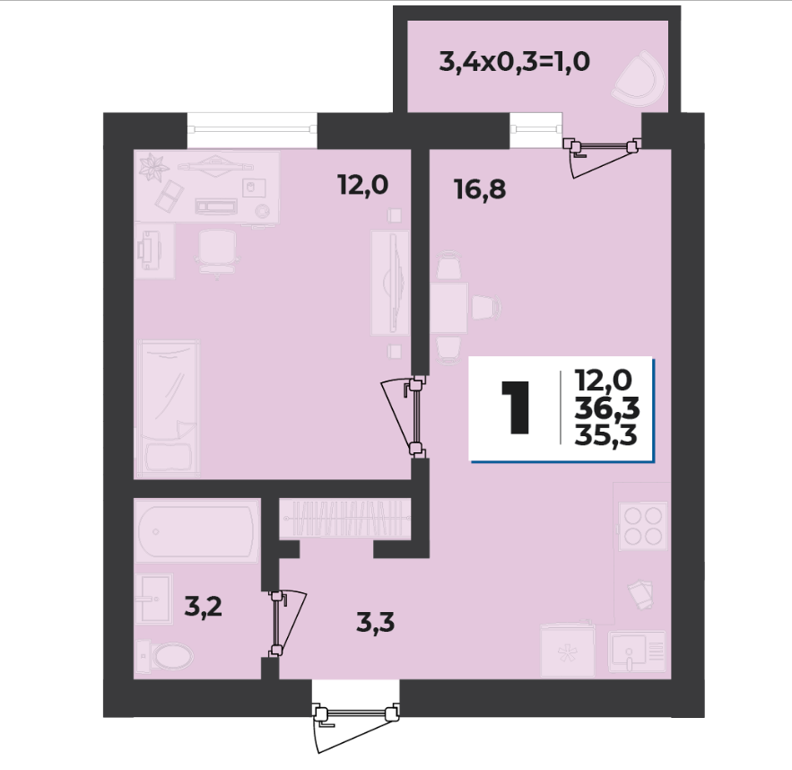 Продается однокомнатная новостройка, 36.3 кв.м., 3/5 эт