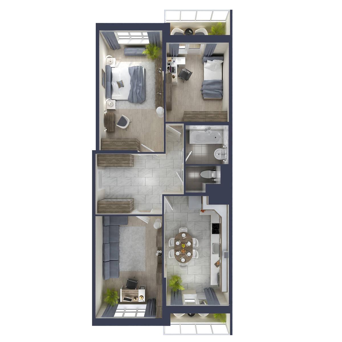 Трёхкомнатная квартира, просторные комнаты, большая кухня-гостиная, две лоджии, раздельный сан.узел, есть место под гардероб.