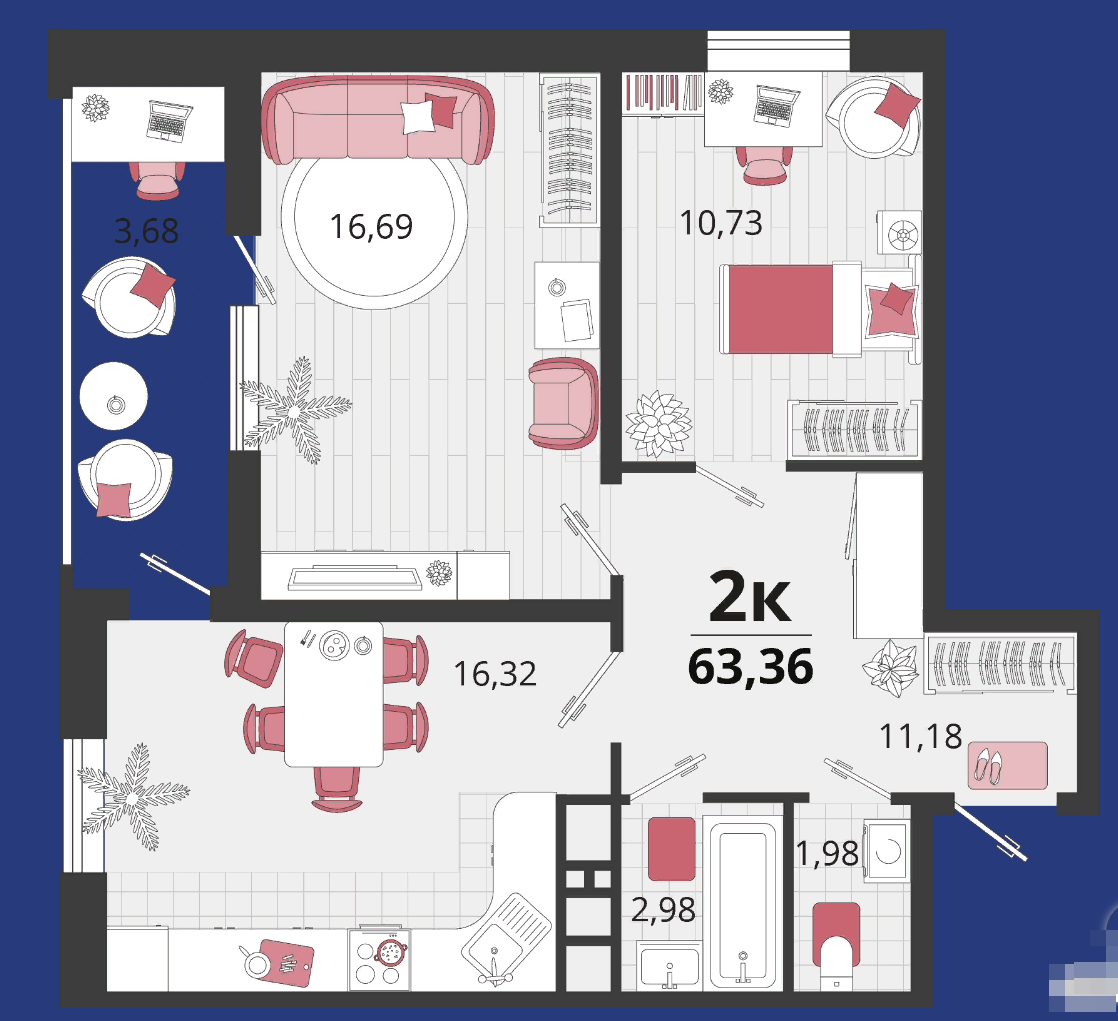 Продается 2-х комн. новостройка, 63.36 кв.м., 10/16 эт