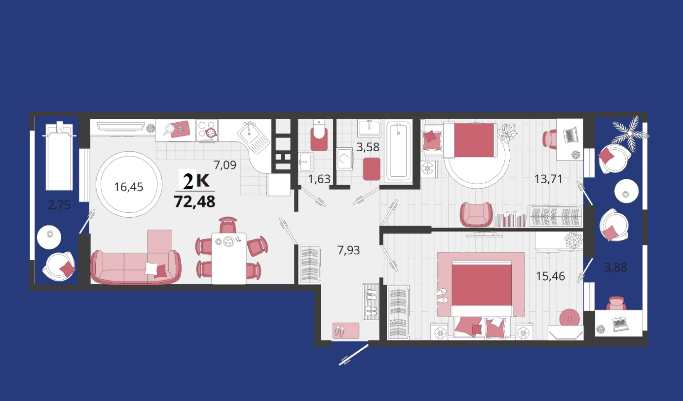 Продается 2-х комн. новостройка, 73 кв.м., 9/9 эт